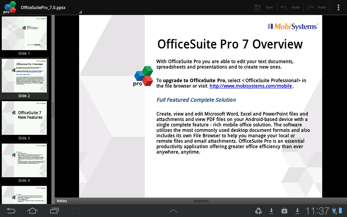 Made by MobiSystems, OfficeSuite Pro allows you to view, create, edit, print and share Microsoft Word, Excel and PowerPoint files on the go. You can also open attachments and see PDF files on an Android based phone or tablet with our feature-rich mobile office solution.