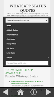 Make your Whatsapp Status interesting daily with our thousands of Whatsapp Statuses.The application gets updated daily in order to provide you a whole bunch of new collection for Whatsapp Status each day :-)