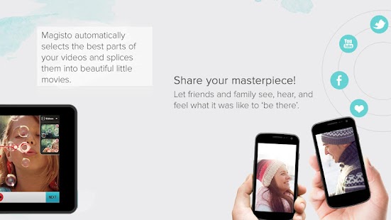 You don’t have to be a video or photo editor or know anything about video or photo editing at all. Magisto will analyze your video and photos and splice it together for you, creating a professional looking movie—an edit that you’ll be proud to share with your friends.